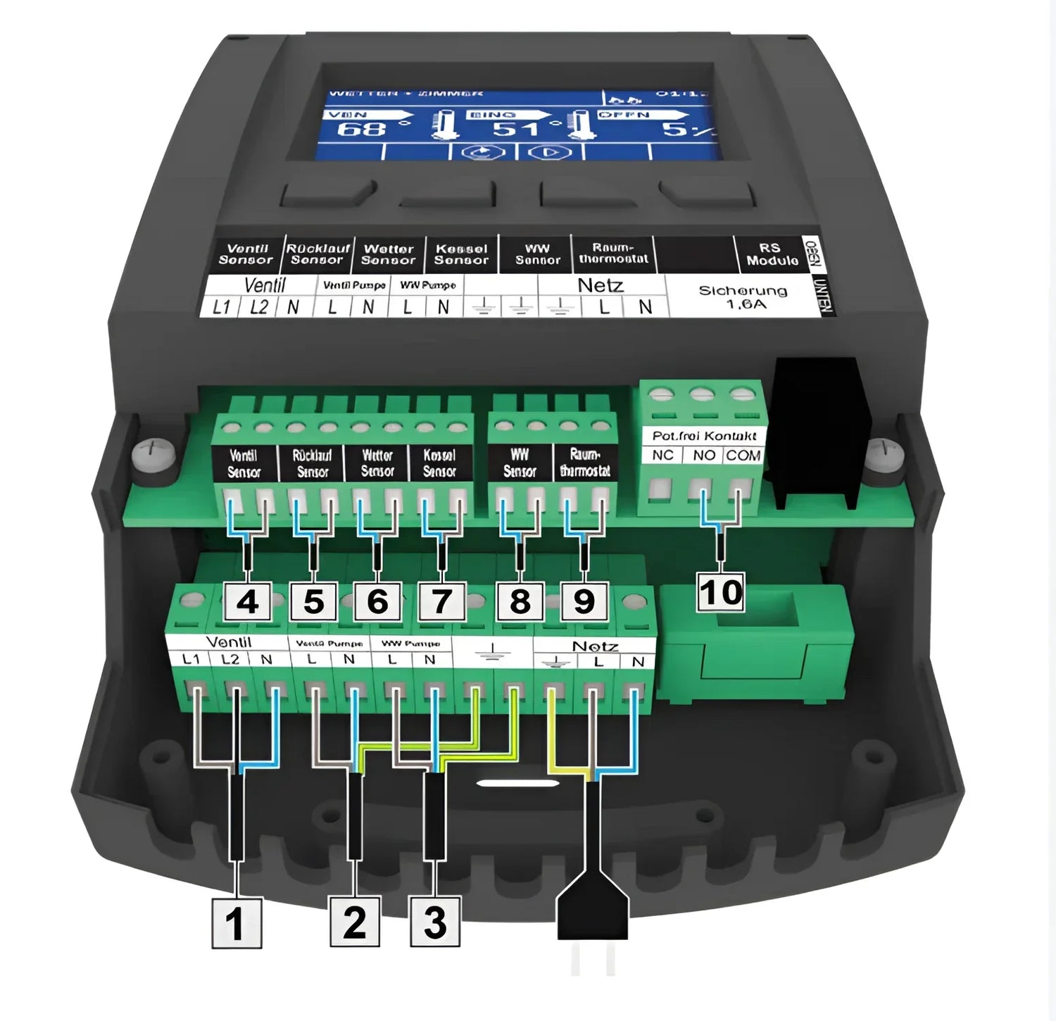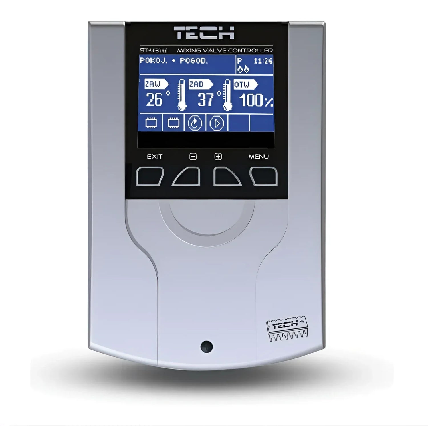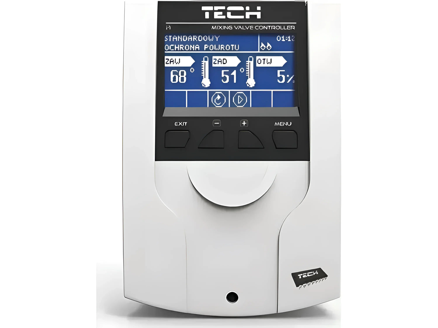 EU-i-1 CWU má 3"-LCD displej s podsvietením, ktorý jasne zobrazuje všetky relevantné informácie. Pre lepšiu presnosť merania je súčasťou balenia niekoľko teplotných senzorov, vrátane senzora teploty kotla, senzora teploty ventilu, senzora teploty spiatočky, senzora vonkajšej teploty a senzora teploty teplej vody. Port USB tiež umožňuje jednoduché aktualizácie softvéru, aby zariadenie bolo vždy aktuálne.