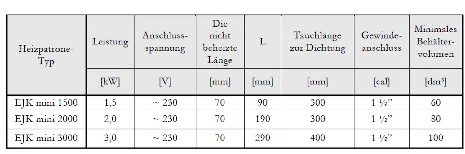 Topný článek má připojení k 1 1/2" Je vybavena vnějším závitem (AG) a pasuje do standardních zásobníků teplé a pitné vody. Díky kompaktní instalační délce 400 mm a nevytápěné délce 70 mm lze topnou patronu rychle a snadno integrovat. Součástí dodávky je 1,5metrový připojovací kabel, který zajišťuje jednoduché a přímé napájení.