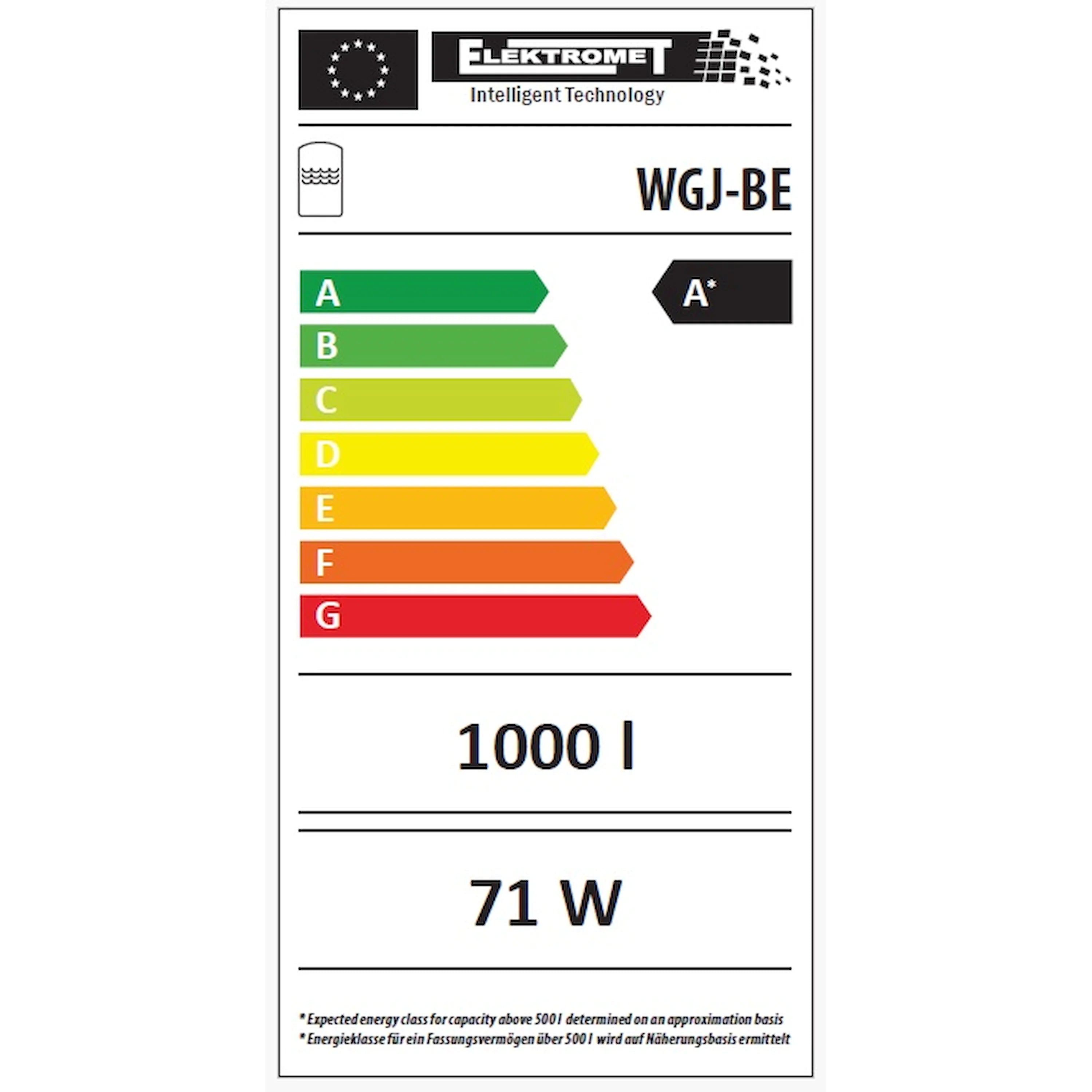 WGJ-BE 800: Objem zásobníku cca 710 l, ztráty v klidovém stavu cca 62 W, hmotnost ~143 kg. WGJ-BE 1000: Objem zásobníku cca 830 l, ztráty v klidovém stavu cca 71 W, hmotnost ~160 kg. Maximální provozní tlak: 0,3 MPa; Maximální provozní teplota: 80 °C.