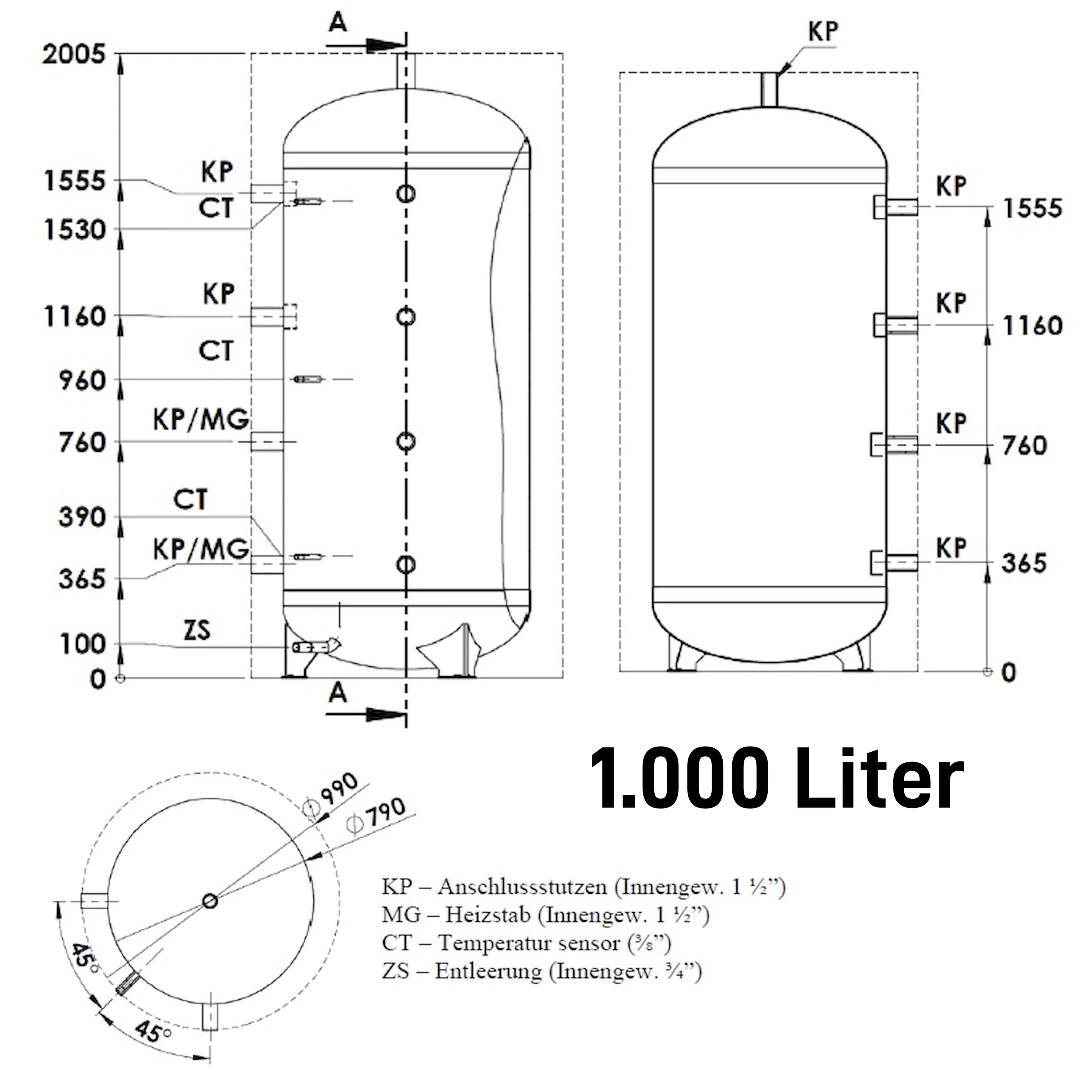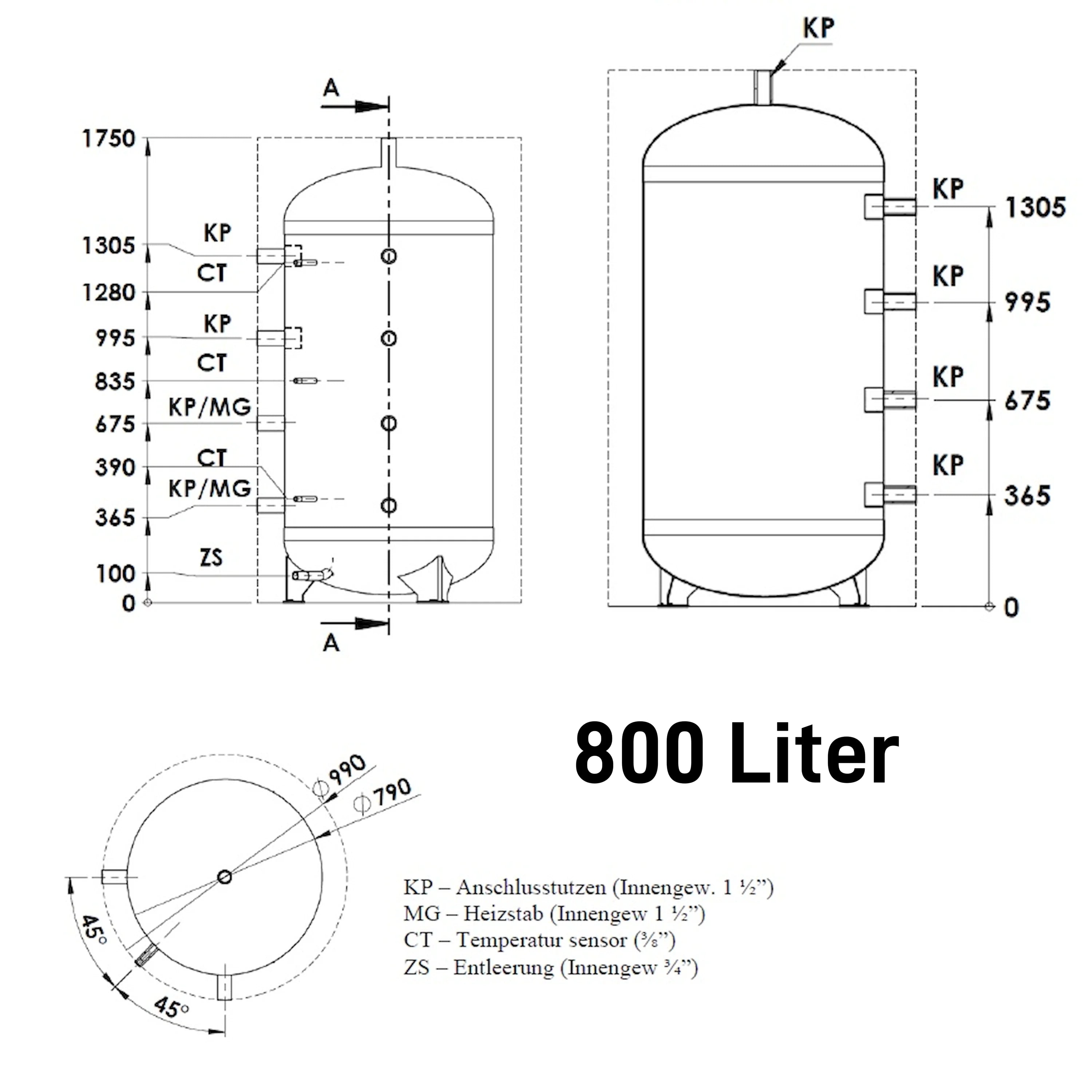 Připojovací rozměry: Připojovací kus (KP) vnitřní závit 1½", připojení topného tělesa (MG) vnitřní závit 1½", připojení teplotního čidla (CT) 3/8", Vnitřní závit odtoku (ZS) 3/4".
