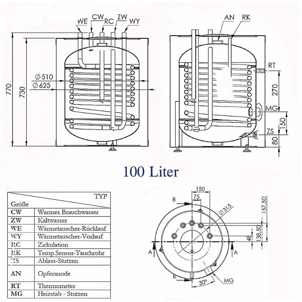Objem: 100 litrů; Plocha výměníku tepla: 1,2 m²; Kapacita výměníku tepla: 5,27 litru. Připojení pro přívod, zpátečku a cirkulaci jsou každé 3/4" AG, doplněno o 1 1/4" IG připojení pro hořčíkovou anodu a 1 1/2" IG připojení pro elektrický topný článek.