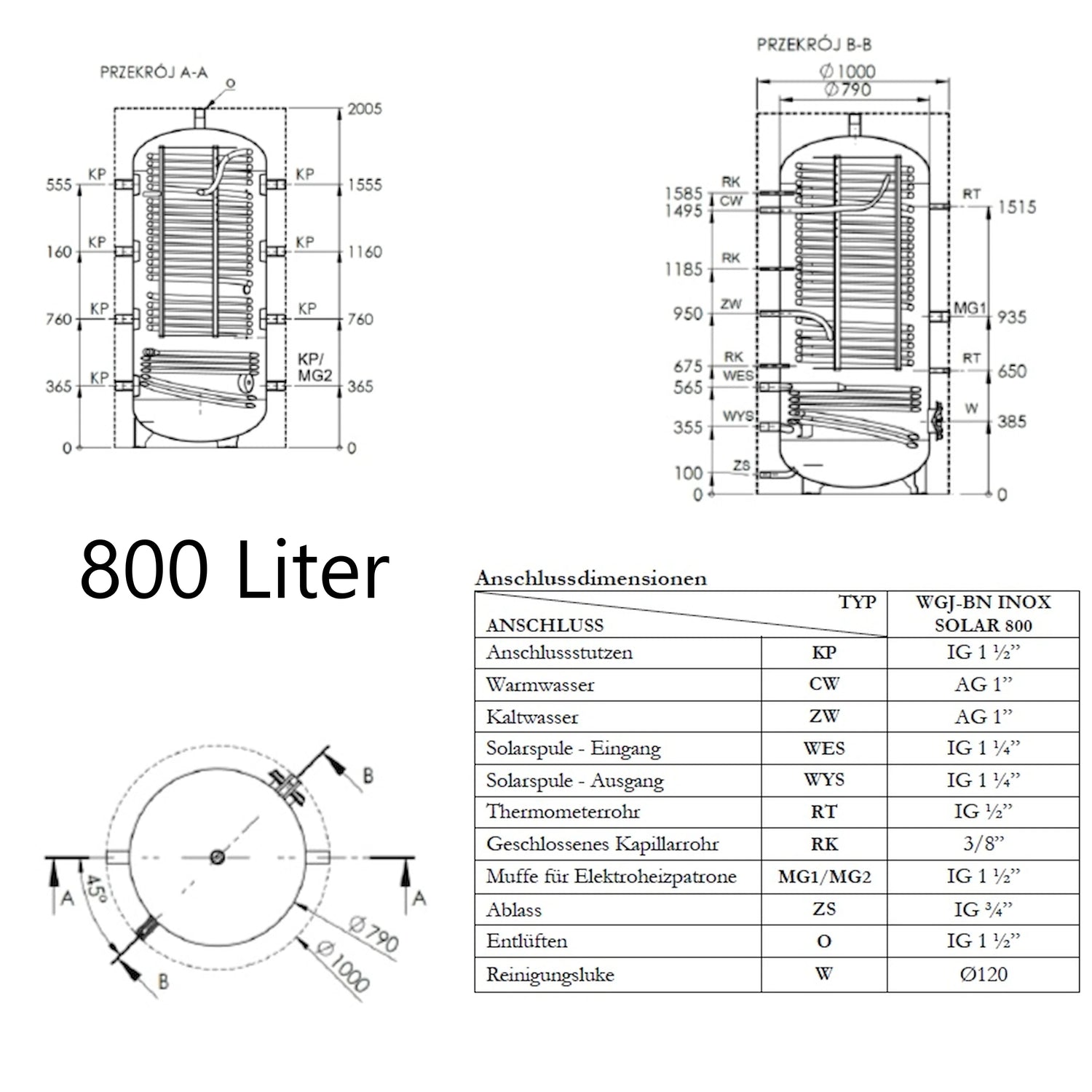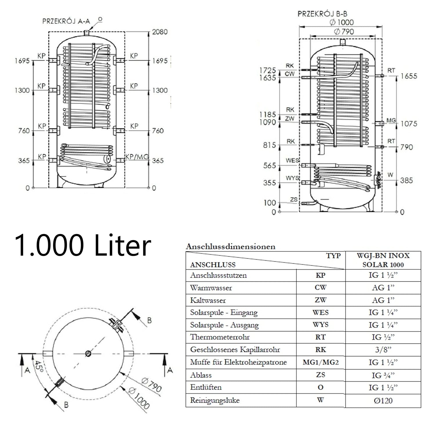 WGJ-BN INOX SOLAR er en kombineret buffertank til opvarmning af vand og varmt brugsvand med en integreret varmespiral i rustfrit stål som varmeveksler. Den er designet til integration i centralvarmesystemer med kedler, varmepumper eller til brug af solvarme og muliggør både lagring af varmeenergi og kontinuerlig opvarmning af drikkevand.