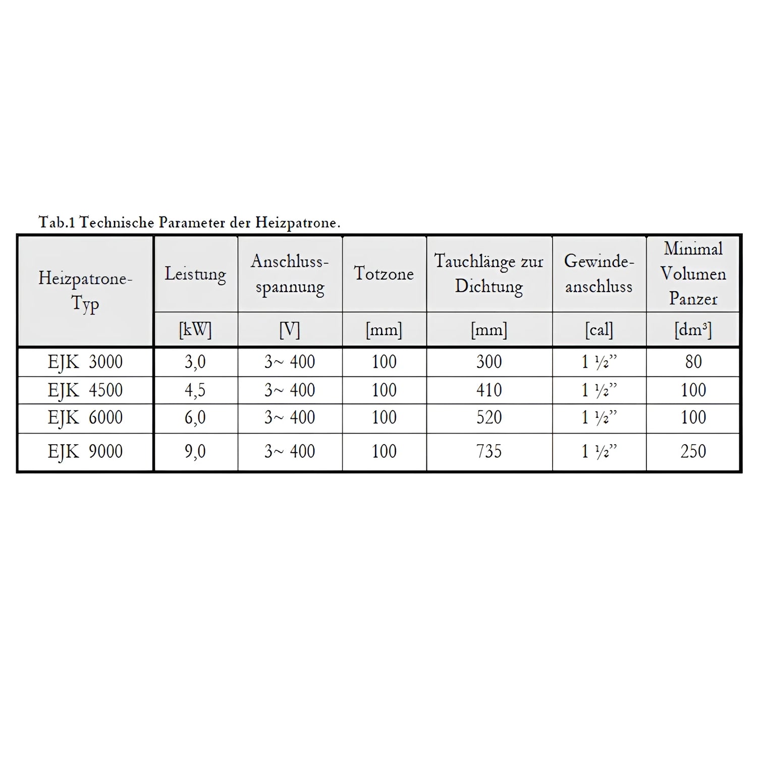 The electric heating element is installed via a 1 1/2" thread and has an installation length of 400 mm and an unheated length of 70 mm. The 1.5 m long connection cable with a Schuko plug enables uncomplicated commissioning.