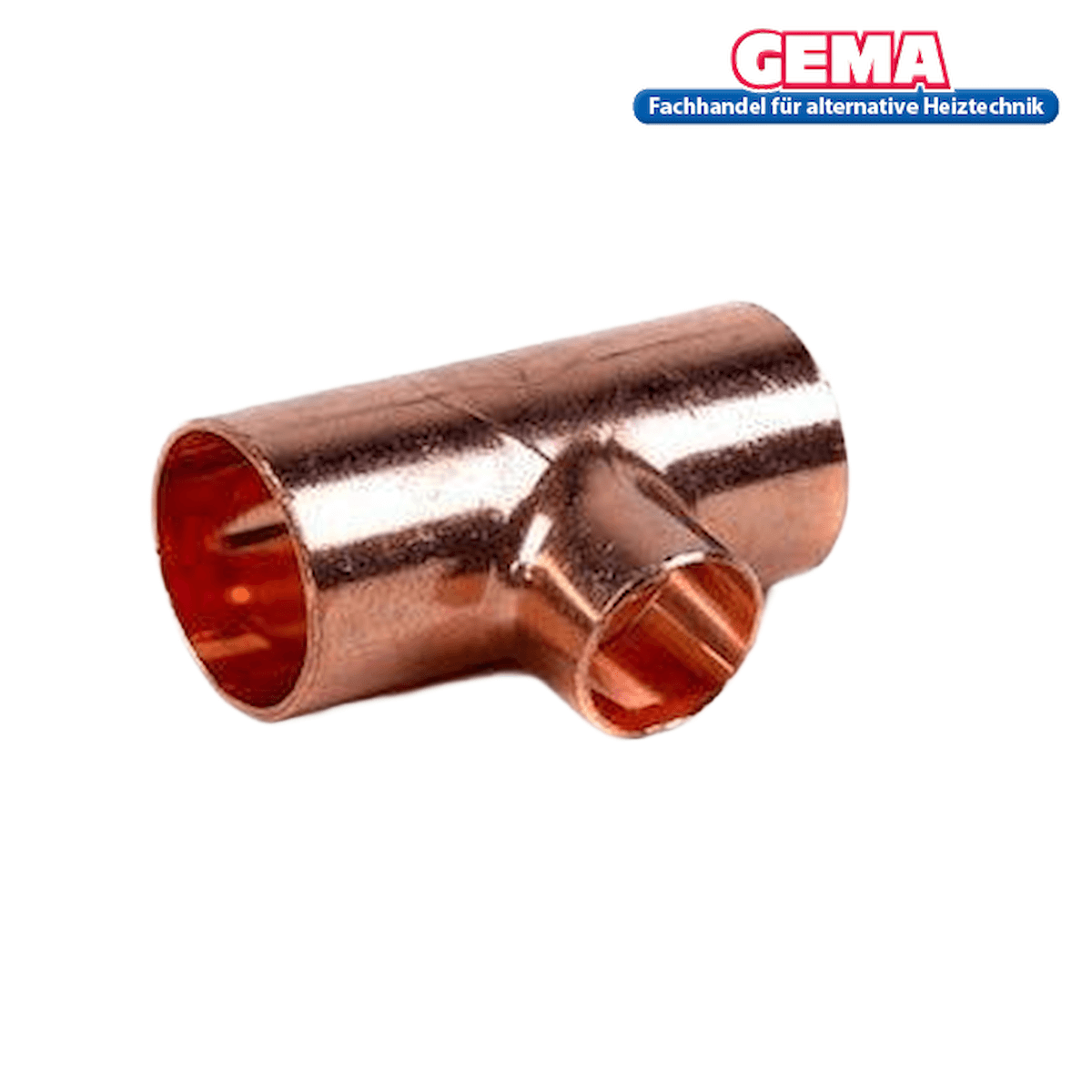 Solder fitting T-piece with two sockets and one reduced socket for copper pipes.