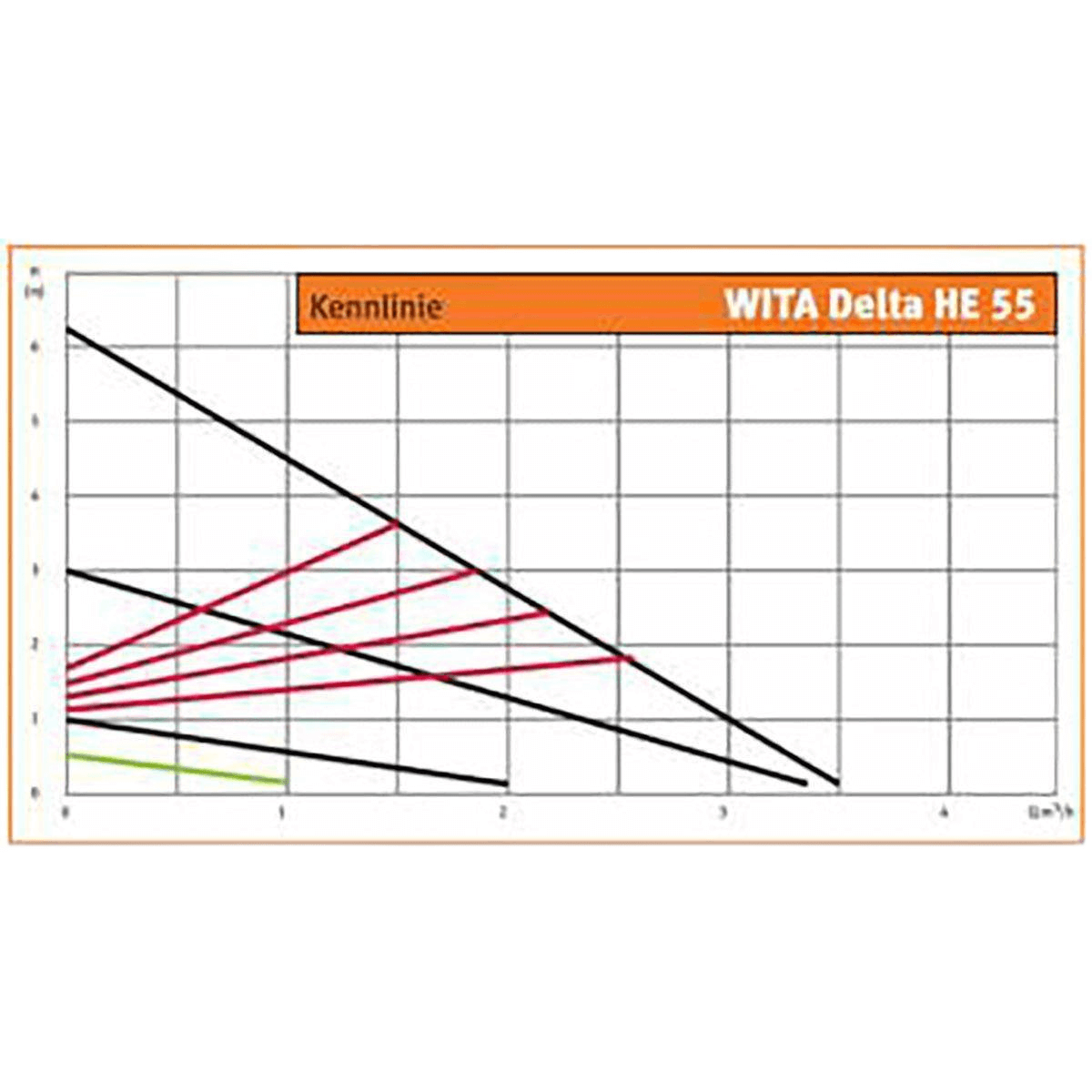 The WITA Delta Plus HE 55-15 S impresses not only with its functionality but also with its technical features. With a discharge head of up to 6 m and a flow rate of 3.2 m³/h, it meets even the most demanding requirements. These values guarantee powerful circulation in heating and solar systems, regardless of the size of your system.