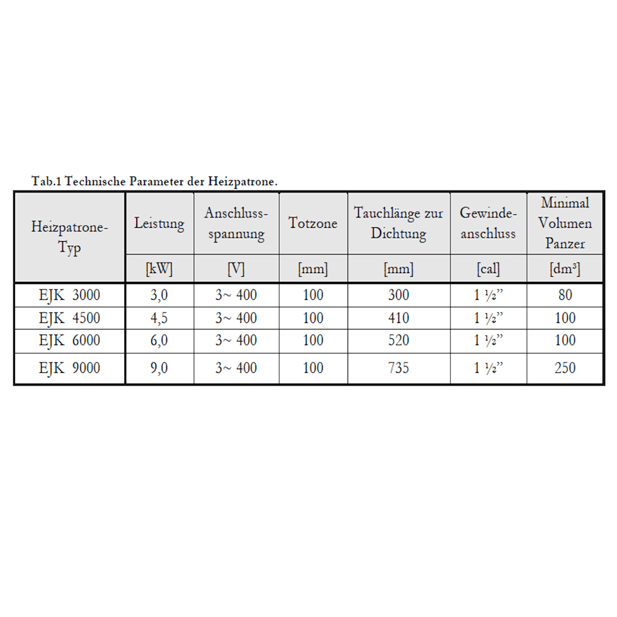Grelni vložek celotnega paketa je na voljo v različnih razredih moči, posebej zasnovanih za 1,5 kW, 2,0 kW, 3,0 kW pri 230 V in 4,5 kW, 6,0 kW in 9,0 kW pri 400 V. Te različice omogočajo optimalno prilagoditev individualnim energetskim potrebam ogrevalnega sistema.