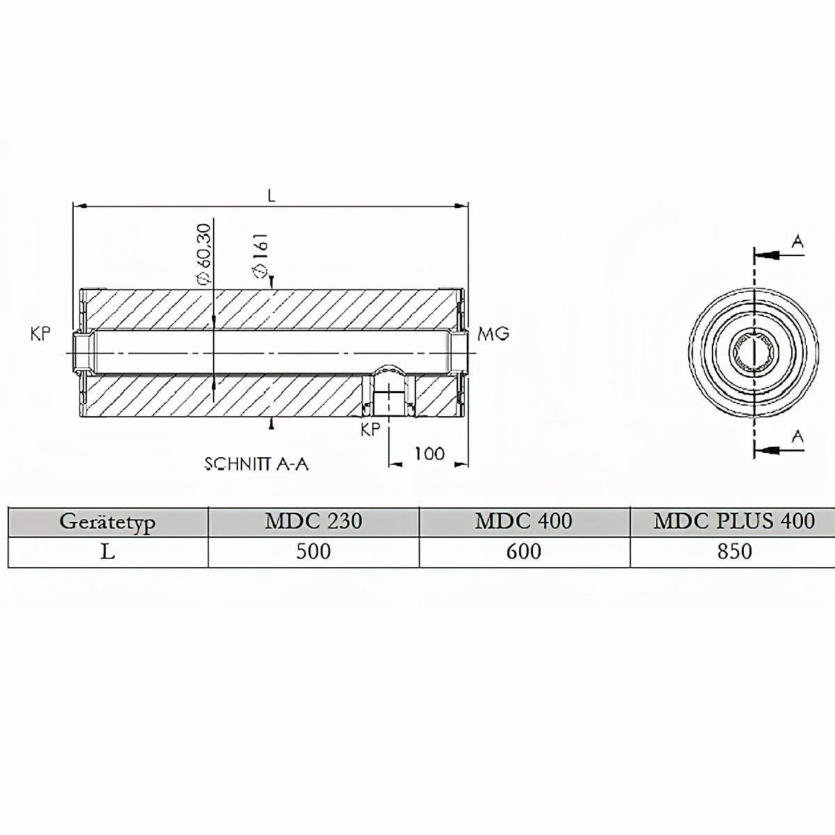 • Dimenzije MDC400 (premer x dolžina): 161 mm x 600 mm